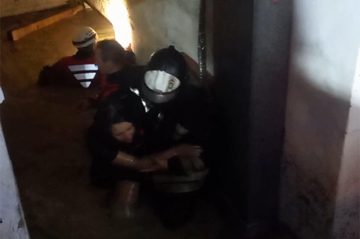 Так как все штатные спасатели были на выездах, на место происшествия выехали лично начальник отряда ЮРПСО МЧС России Андрей Пазынич и его заместитель Юрий Фомин. По прибытии они пытались докричаться до людей, однако было очень плохо слышно. Помещение затопило почти полностью, люди были в воде. Спасателям удалось выломать решетку вентиляции. Затем с помощью гидравлического инструмента они отжали дверь.